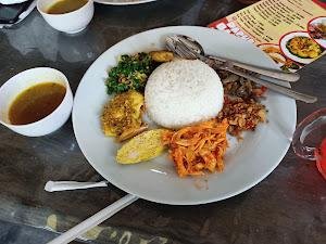 | Nasi Ayam Bali | enak, porsi banyak, lauk komplit. ada ayam sisit, tum, sate lilit, urap, kuah, nasinya banyak. suksma |