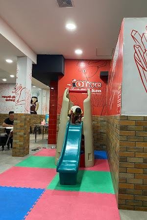 Begitu memasuki Olive Fried Chicken, suasana yang hangat dan ramah langsung menyambut. Meja dan kursi yang bersih serta area makan yang cukup luas membuat pengunjung merasa nyaman. Meskipun tempat ini sering ramai, terutama saat jam makan malam, kehadiran playground untuk anak-anak membuatnya menjadi pilihan ideal bagi keluarga. Namun, perlu diingat bahwa parkirannya terbatas, jadi datanglah lebih awal jika Anda membawa kendaraan.