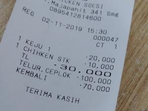 Gue juga sempet baca review dari pengunjung lain, ada yang bilang makanan di sini enak tapi harganya agak pricey dan sayangnya ga ada es teh. Ada juga yang bilang, semua baik-baik aja, cuma karena cuaca panas, mungkin perlu ditambah pendingin ruangan. Dan ada yang bilang tempat ini udah bukan Rocket Chicken lagi, sekarang namanya Chicken Soesi. Steaknya cuma 10k, dagingnya ga pelit, tapi masaknya kurang pas, amisnya masih kerasa. Untuk saus keju, kejunya juga ga terlalu kerasa. Pelayanan di sini masih ada kekurangan, sempet agak lama karena kasirnya bingung. Mungkin karena tempatnya masih baru, jadi dimaklumin deh.