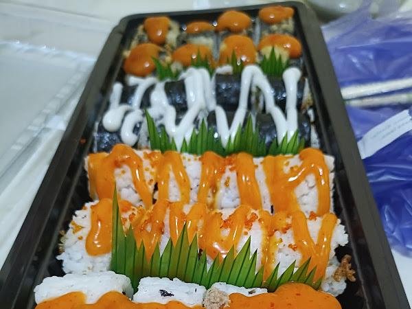 Gue juga sempet baca review dari pengunjung lain yang bilang kalau sushi di sini murah meriah tapi rasanya lumayan. Memang bukan sushi premium, tapi nasi sushinya gak manis dan isian variatif, ada tempura dan Kani. Sayangnya, mereka gak jual minuman, padahal sushi cocoknya dimakan sama ocha, sayang banget!